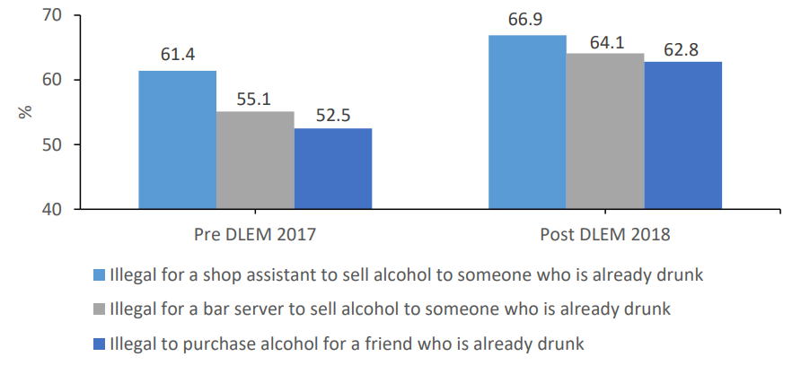 Figure 11: Percentage of participants who held knowledge of the laws around the service of alcohol to, and the purchase of alcohol for intoxicated people pre (2017) and post-intervention (2018) user survey. Source:Quigg et al., 2019.