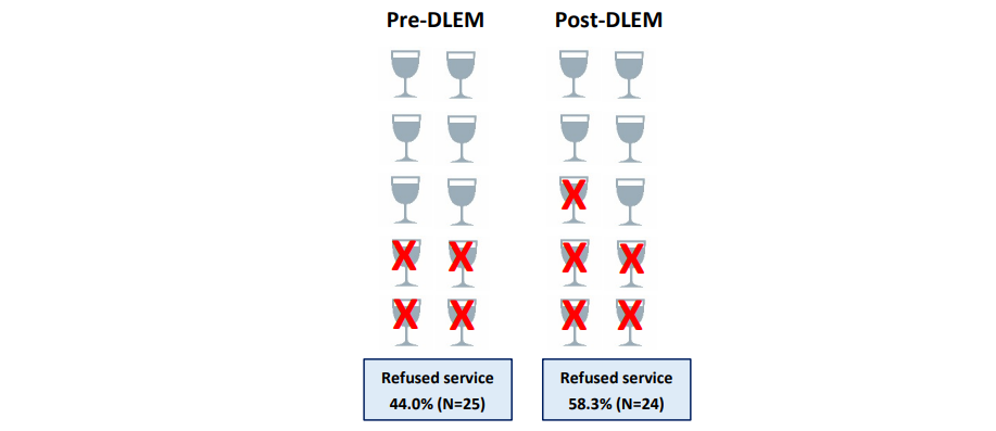 Figure 12: Bar server propensity to refuse alcohol to pseudo-intoxicated actors, pre (2017) and post (2018) alcohol test purchases. Source: Quigg et al., 2019.